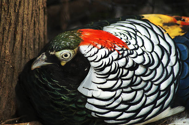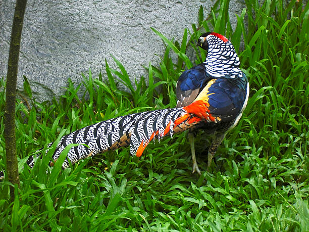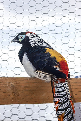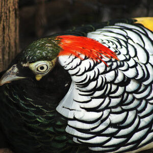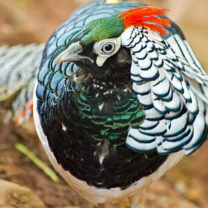 The Lady Amherst’s Pheasant, found in Southwestern China and Northern Burma, is an ornamental bird commonly found in the collections of many aviculture enthusiasts across the United States. It is considered a ruffed pheasant, since the males sport an elaborate ruff which is utilized during the courtship displays. The males take two years to acquire their breeding plumage, which features multiple contrasting colors. The crown of the males is dark green, followed by a red crest. The ruff consists of white feathers outlined with black, creating a stunning scaled effect. The facial skin is supposed to be light blue. The underside of the males is supposed to be a pure white color (hints of buff or red coloring suggest a hybrid).